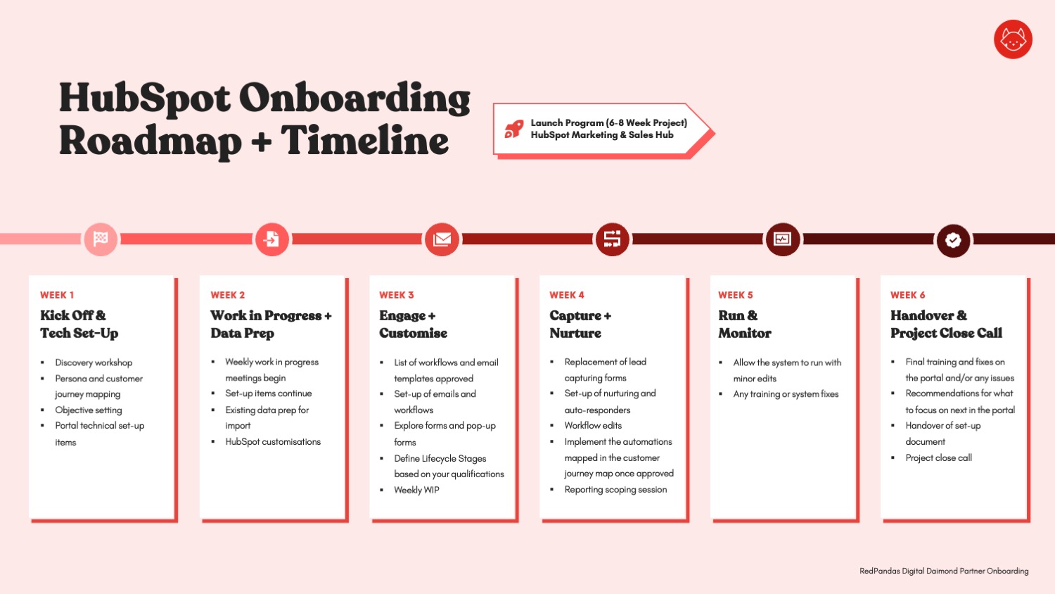 Pricing wise every agency is a little different. At RedPandas our onboarding pricing is purposely priced competitively alongside ‘HubSpot’s Professional Onboarding’ price. This way you get all the guidance and resources you would purchasing from HubSpot but with the added benefit of execution and someone helping you do the work as well.